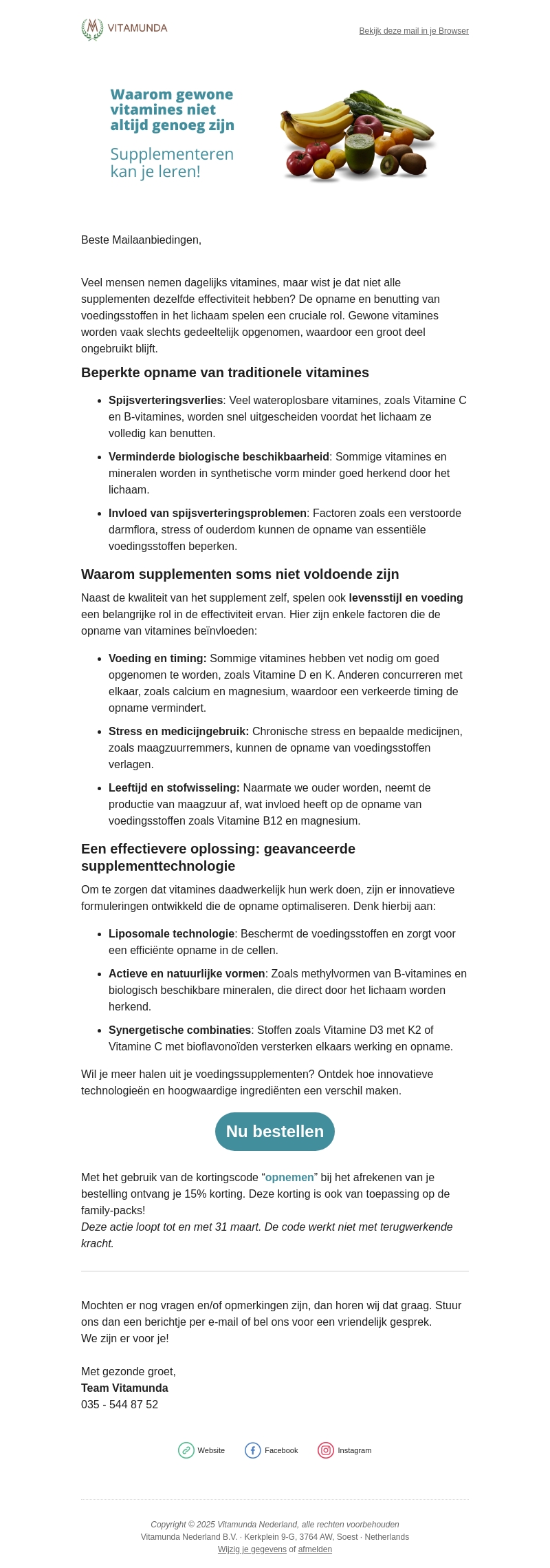 Gewone vitamines worden vaak niet volledig door het lichaam opgenomen, wat kan leiden tot een inefficiënte benutting. Deze nieuwsbrief legt uit waarom dit gebeurt en welke factoren hierop van invloed zijn, zoals spijsverteringsproblemen en ouderdom. Daarnaast wordt een effectievere oplossing geschetst: de geavanceerde supplementtechnologie van Vitamunda.