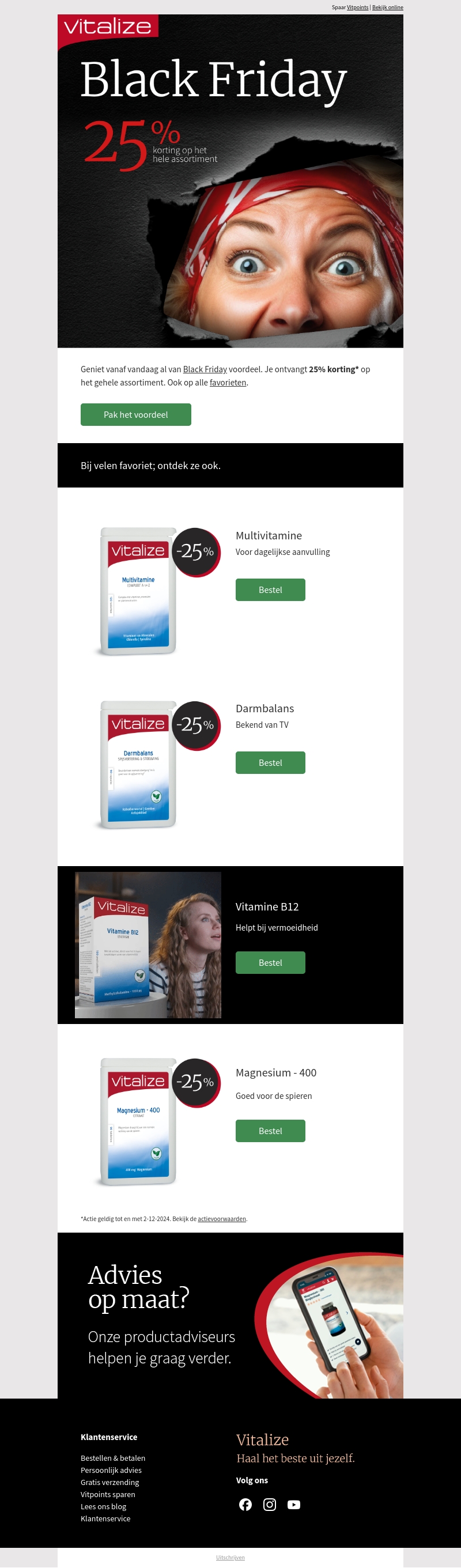 Ontdek de geweldige Black Friday deals bij Vitalize met 25% korting op alles in het assortiment. Kies uit multivitaminen, darmbalans en meer voor jouw dagelijkse gezondheidsboost. Deze actie geldt tot 2 december 2024, dus wees er snel bij. Bekende favorieten zijn nu nog aantrekkelijker geprijsd. Bekijk online voor meer details en bestel eenvoudig.