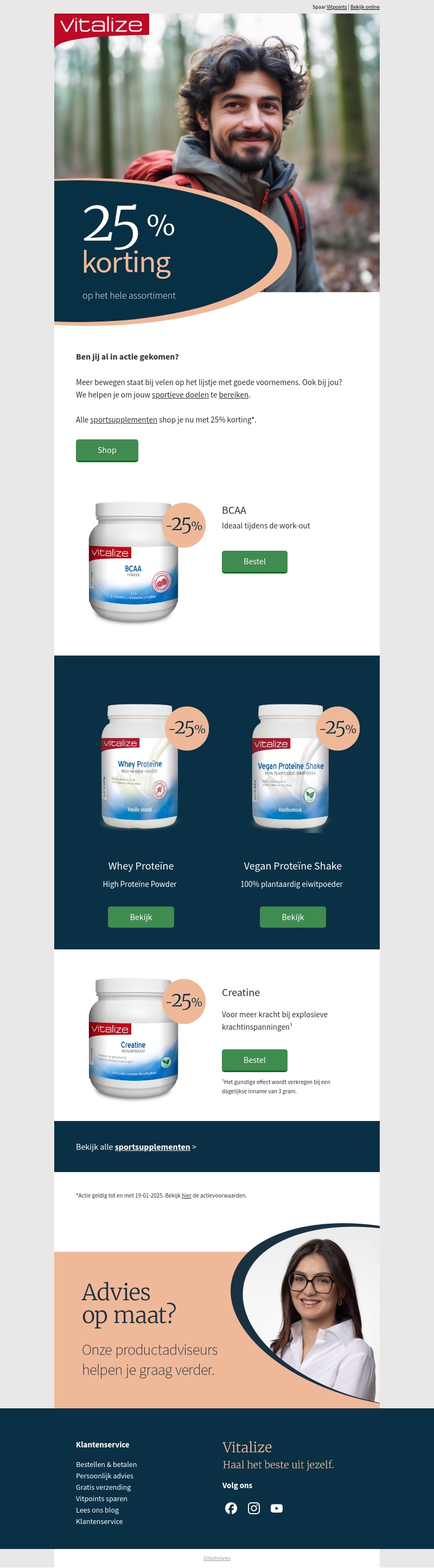 Ontdek de voordelen van 25% korting op al je favoriete sportsupplementen bij Vitalize. Of je nu kiest voor BCAA's, Whey- of Vegan ProteΓ―ne Shakes, je haalt het beste uit elke workout. Onze producten zijn ideaal voor spieropbouw en krachtversterking. Mis deze kans niet om je sportieve doelen te bereiken met uitstekende voeding. Het aanbod is geldig tot 19 januari 2025.