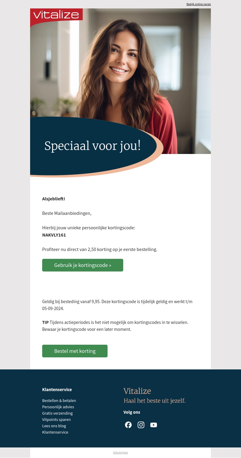 Beste Mailaanbiedingen, ontvang jouw unieke persoonlijke kortingscode NAKVLY161 en profiteer direct van β¬2,50 korting op je eerste bestelling bij Vitalize. De code is geldig bij een besteding vanaf β¬9,95 en werkt t/m 05-09-2024. Tip: Bewaar je kortingscode voor later gebruik.