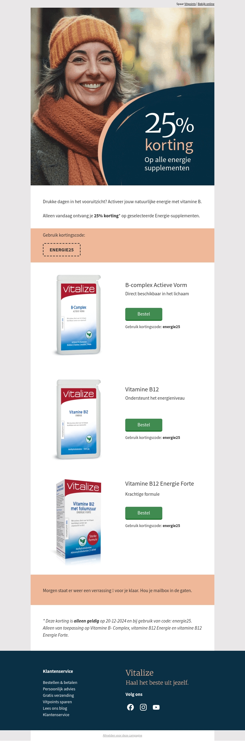 Actieve dagen in het vooruitzicht? Ontdek onze energie supplementen met 25% korting. Alleen vandaag heb je de kans om vitamines zoals B-complex en B12 te bemachtigen tegen gereduceerde prijzen. Gebruik de kortingscode 'ENERGIE25' bij jouw aankoop en boost je natuurlijke energie. Mis deze unieke kans niet en verbeter je welzijn met Vitalize!