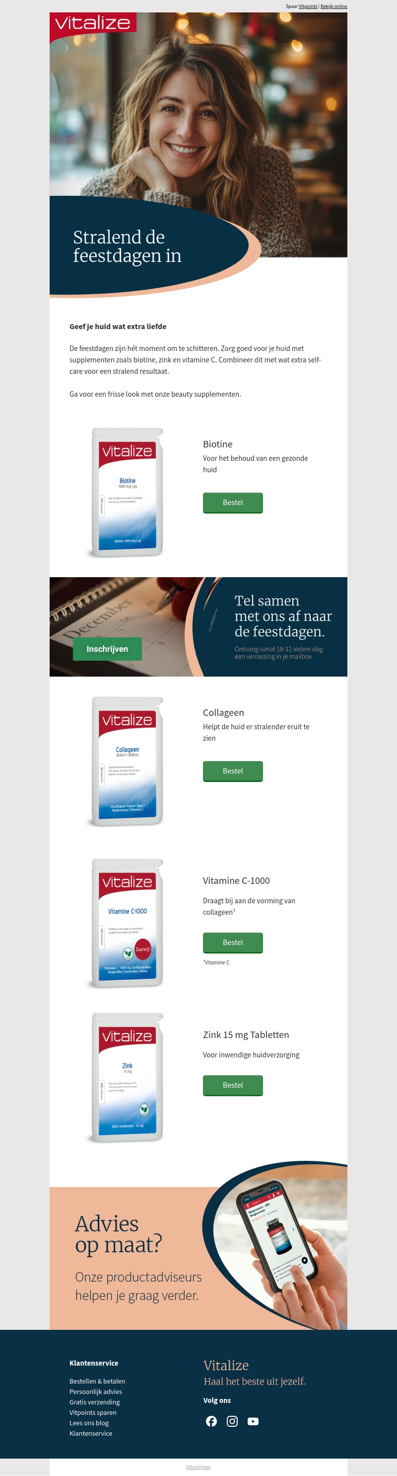 Vitalize biedt een reeks beauty supplementen zoals biotine, collageen en vitamine C om jouw huid te laten stralen tijdens de feestdagen. Verwen jezelf met deze producten en krijg deskundig advies van onze gespecialiseerde teamleden.