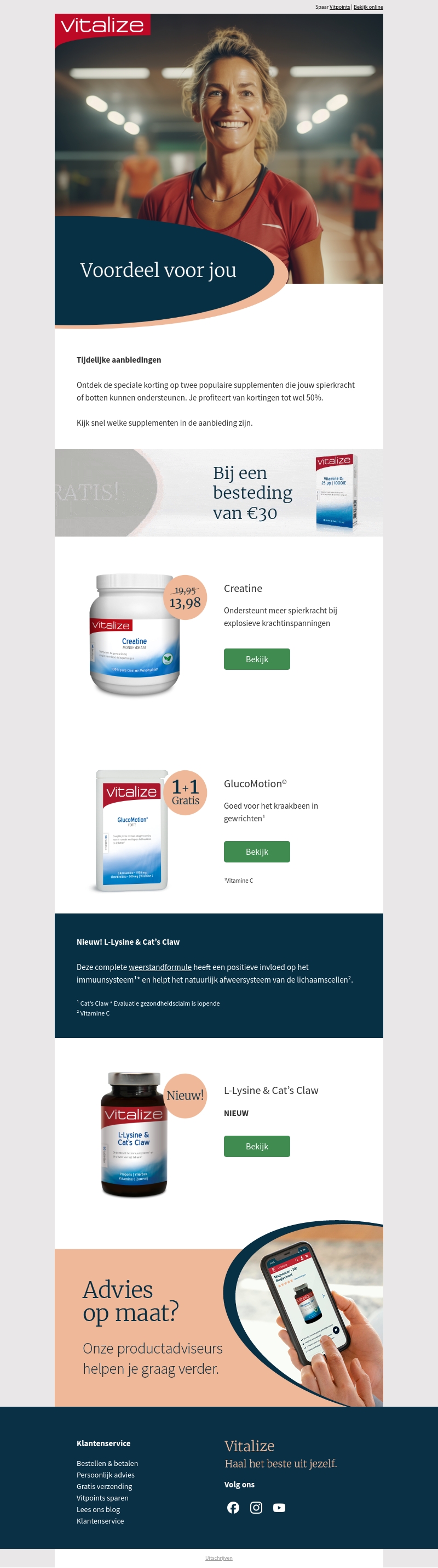 Bekijk de speciale kortingen op onze populaire creatine en GlucoMotion producten waarmee je kracht en gewrichten ondersteunt. De aanbiedingen omvatten kortingen tot wel 50% en exclusieve deals zoals 1+1 gratis. Nieuw in ons assortiment is L-Lysine & Catβs Claw, een formule om je immuunsysteem te boosten.