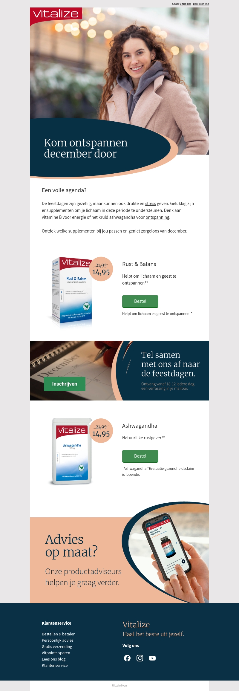 De feestdagen brengen gezelligheid, maar ook stress. Vitalize biedt supplementen die helpen bij ontspanning, zoals vitamine B en ashwagandha. Ontdek nu wat bij jou past en geniet zorgeloos van de decembermaand.