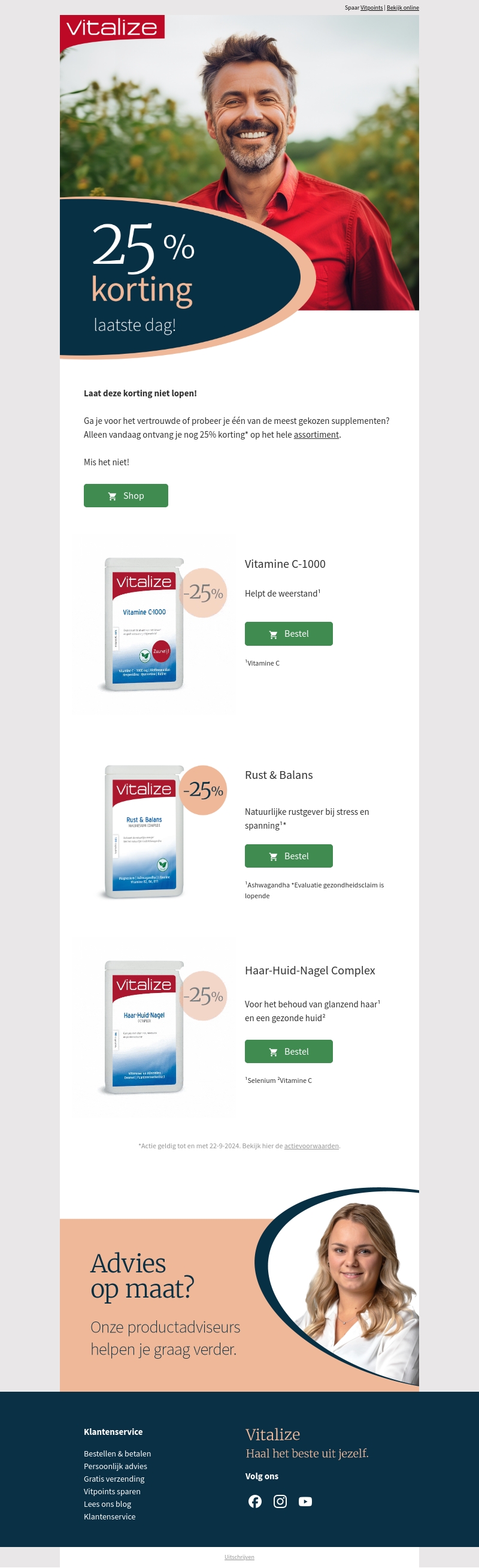 Laat deze korting niet lopen! Ontvang vandaag nog 25% korting op het hele assortiment van Vitalize. Verkrijgbaar zijn onder andere Vitamine C-1000, Rust & Balans en Haar-Huid-Nagel Complex. Mis het niet! Bezoek nu onze webshop en bestel jouw favoriete supplementen.