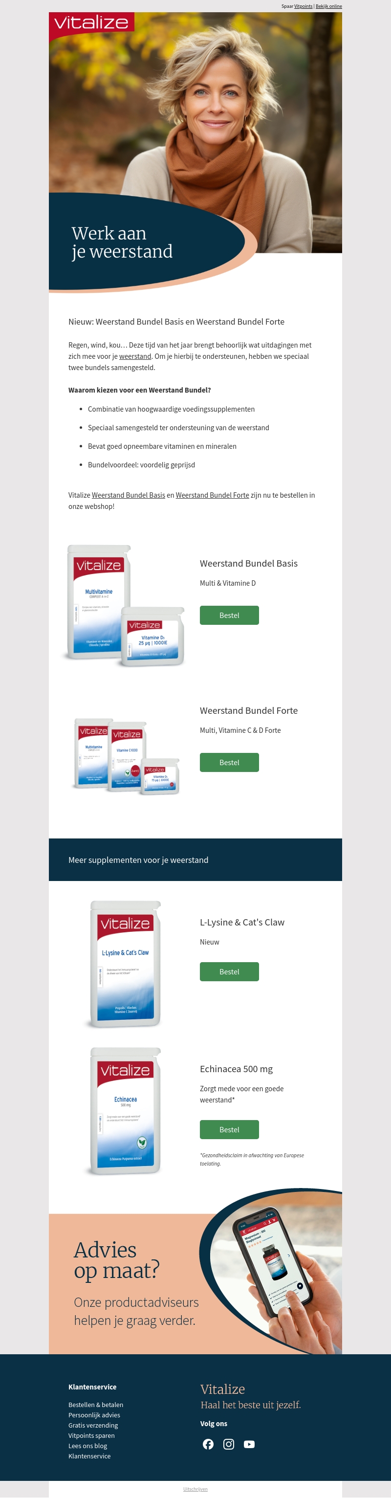 Vitalize introduceert de Weerstand Bundel Basis en Weerstand Bundel Forte. Deze bundels zijn speciaal samengesteld met hoogwaardige voedingssupplementen ter ondersteuning van je weerstand. Ze bevatten goed opneembare vitaminen en mineralen, ideaal voor het koude seizoen. Beschikbaar in onze webshop met bundelkorting.