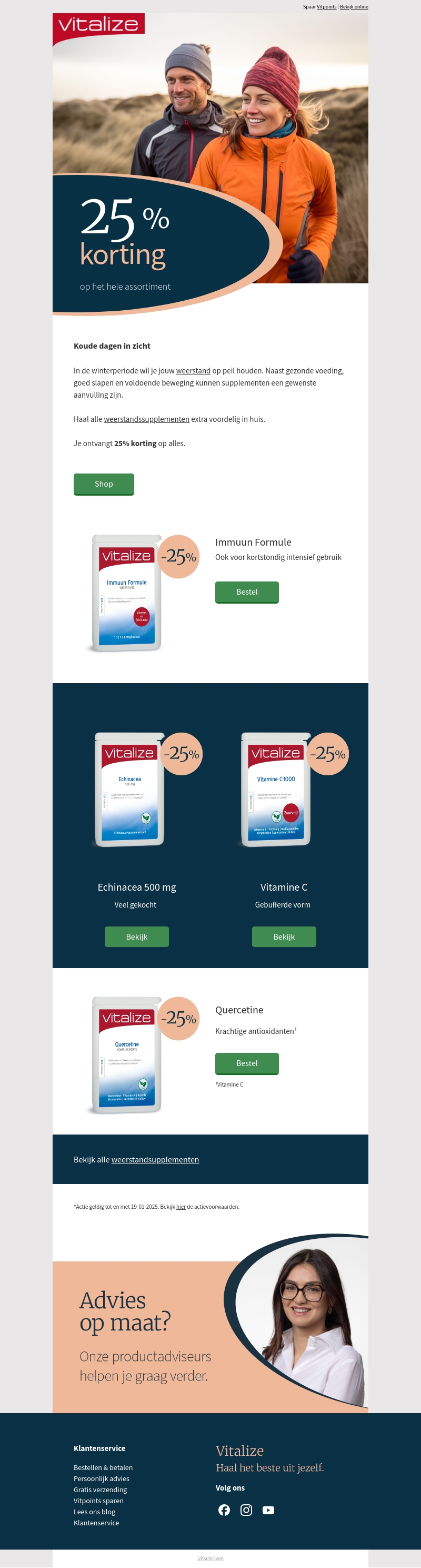 Geniet van 25% korting op het volledige assortiment van Vitalize. Bereid je voor op de winter met diverse weerstandssupplementen. Profiteer van deze aanbieding voor een gezondere levensstijl. Kies uit producten zoals Immuun Formule, Echinacea, en meer. Mis deze kans niet om te besparen en je gezondheid te ondersteunen.