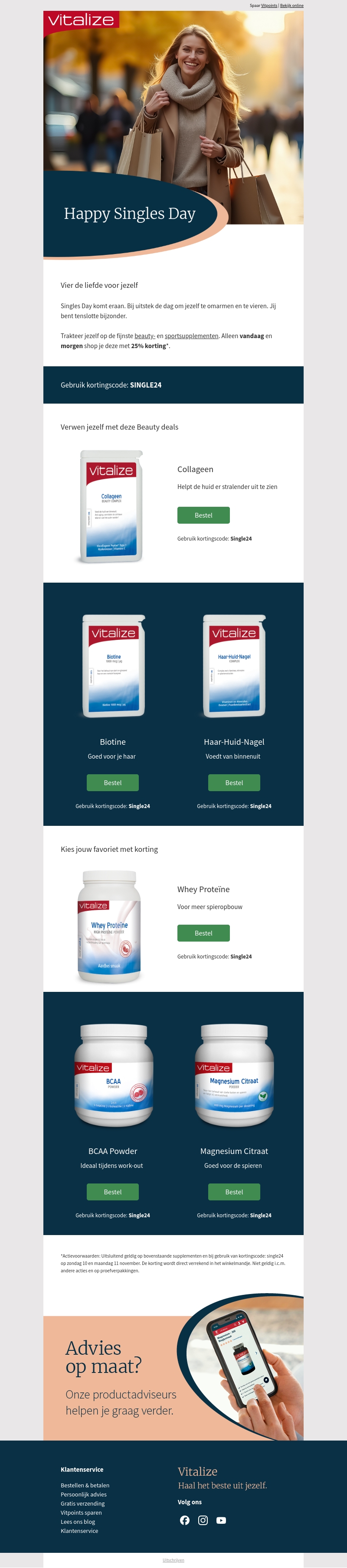 Singles Day nadert, het perfecte moment om jezelf te verwennen bij Vitalize. Geniet van speciale kortingen op beautyproducten en sportsupplementen. Alleen vandaag en morgen profiteer je van 25% korting. Gebruik de kortingscode SINGLE24 bij je bestelling. Ervaar hoogwaardige producten zoals collageen, biotine en proteïne. Ontvang professioneel advies van onze productadviseurs.