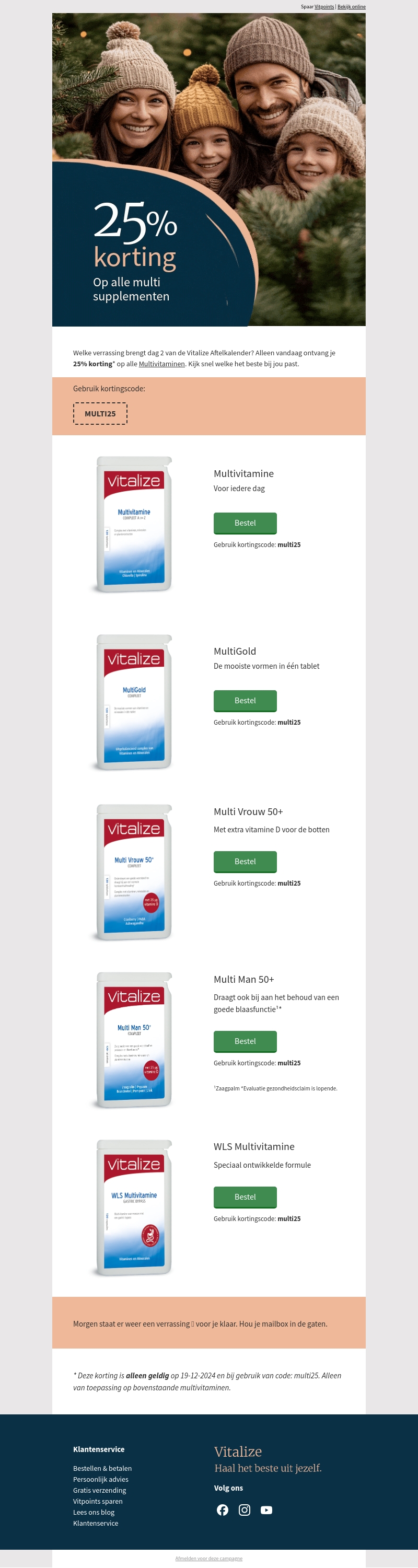 Dag 2 van de Vitalize Aftelkalender biedt een speciale verrassing: 25% korting op alle multivitaminen! Ontdek het aanbod en vind het supplement dat bij jou past. De actie is geldig op 19-12-2024. Mis deze exclusieve kans niet.