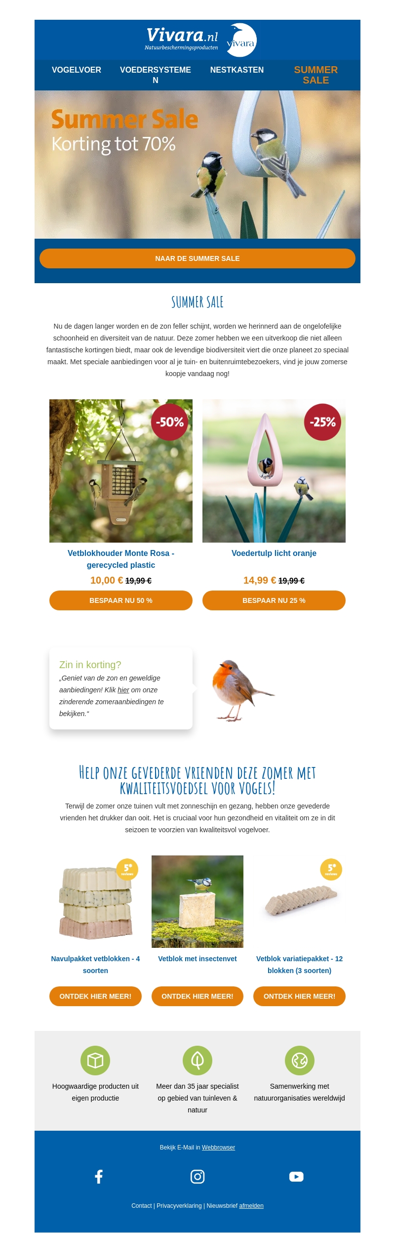De Summer Sale bij Vivara.nl is begonnen met kortingen tot 70%! Geniet van geweldig geprijsde producten om de schoonheid van de natuur te vieren. Bekijk speciale aanbiedingen voor tuin- en buitenruimtebezoekers, zoals vetblokken en voedertulpen. Shop nu en bespaar groot!