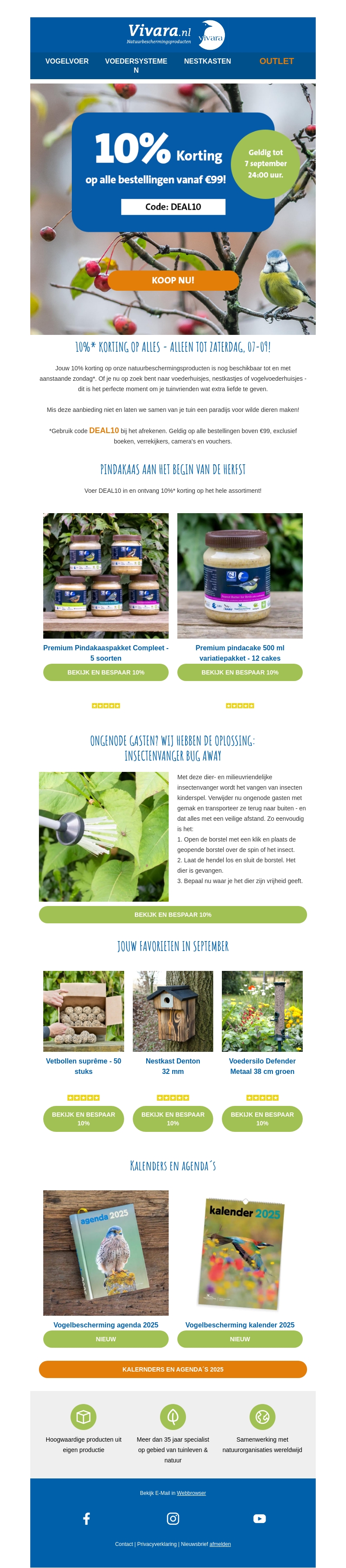 Ontvang 10% korting op alle bestellingen vanaf β¬99 bij Vivara. Gebruik code DEAL10 vΓ³Γ³r 7 september 24:00 uur. Maak je tuin een paradijs voor wilde dieren met onze voedersystemen, nestkasten en meer. Inclusief een speciale sectie over pindakaas voor vogels en oplossingen tegen ongewenste insecten.