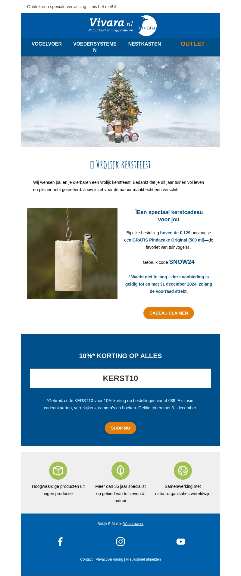 Kerst is bij Vivara extra speciaal met unieke aanbiedingen en geschenken. Bij elke bestelling boven de €129 krijg je een gratis Pindacake Original. Gebruik de code SNOW24 voor extra voordelen. Mis de 10% korting op alles met de code KERST10 niet. Haal meer uit je kerstinkopen met Vivara!