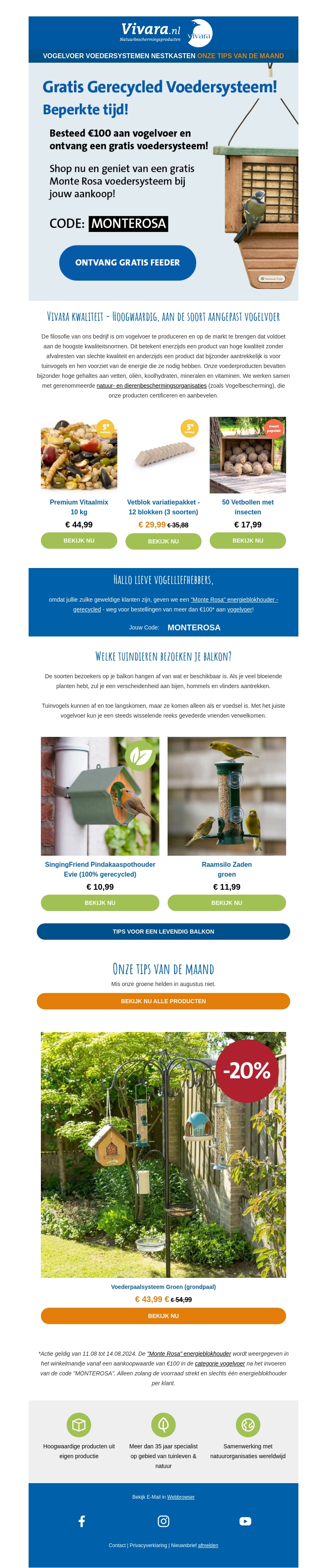 Ontvang een gratis Monte Rosa voedsysteem bij een besteding van β¬100 aan vogelvoer. Mis deze beperkte tijd aanbieding niet. Profiteer nu en bekijk ons assortiment!