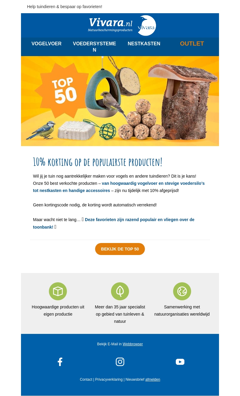 Profiteer nu van een speciale korting van 10% op onze 50 best verkochte producten! Van hoogwaardig vogelvoer tot nestkasten en handige accessoires, er is voor ieder wat wils. De korting wordt automatisch verrekend, geen code nodig. Wees er snel bij, want deze favorieten zijn enorm populair!