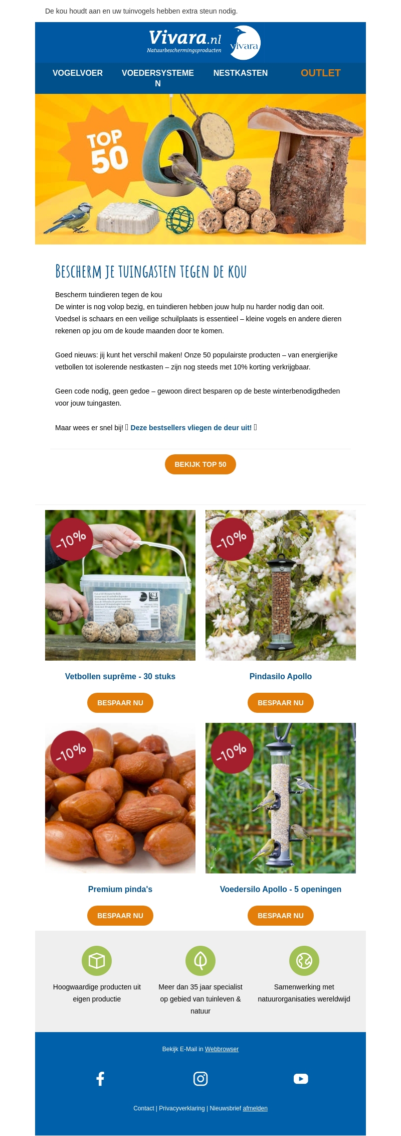 De winter is in volle gang en je tuinvogels hebben extra zorg nodig. Vivara biedt nu tot 10% korting op hun 50 populairste producten. Van voedersystemen tot isolerende nestkasten, grijp deze kans om je tuin optimaal voor te bereiden op de koude maanden. Geen code nodig, profiteer direct van de aanbieding!