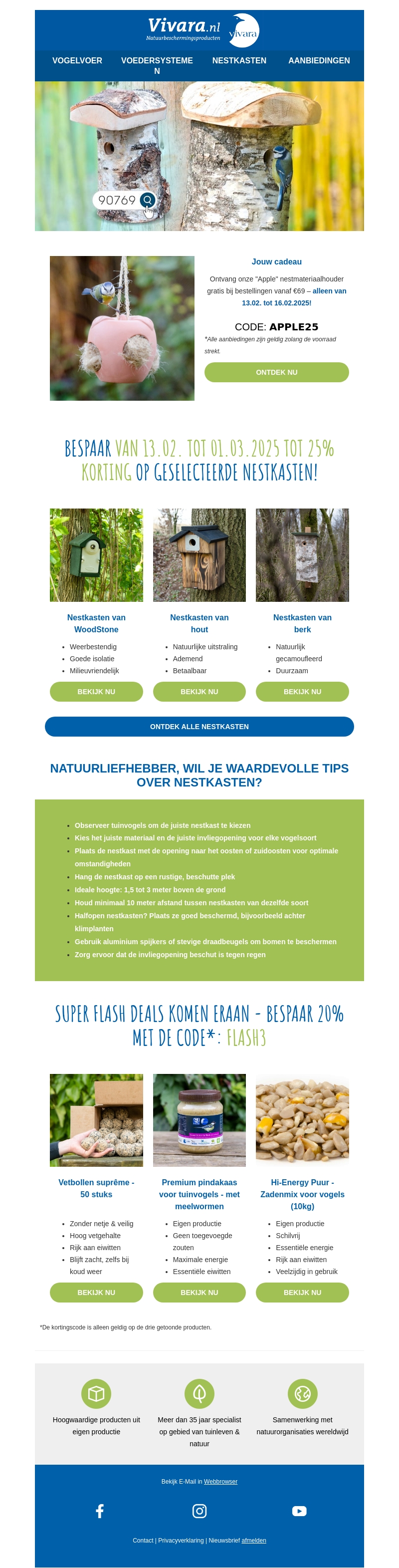 Ontdek de nieuwste nestkasten van Vivara en ontvang exclusieve kortingen. Profiteer van duurzame en weerbestendige modellen geschikt voor elke tuin. Mis de gratis Apple nestmateriaalhouder en waardevolle tips voor optimale omstandigheden niet. Dit geldt bij een bestelling vanaf β¬59. Red nu snel je voordeel!