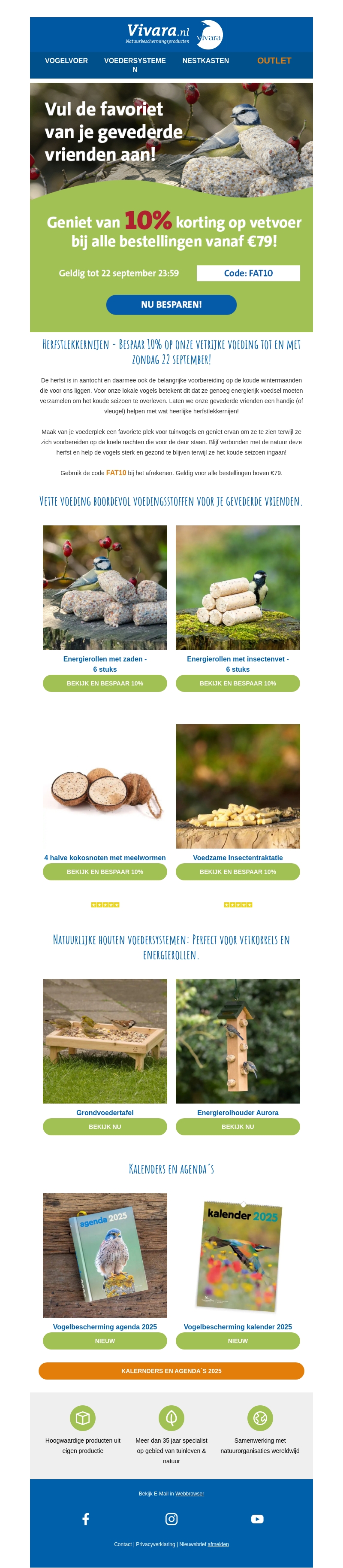 De herfst is aangebroken en dat betekent tijd voor heerlijke herfstlekkernijen! Verwen je gevederde vrienden met voedzame snacks en geniet van 10% korting op vetvoer bij bestellingen vanaf €79. Gebruik de code FAT10 en zorg ervoor dat je vogels gezond en blij de koude maanden doorkomen.
