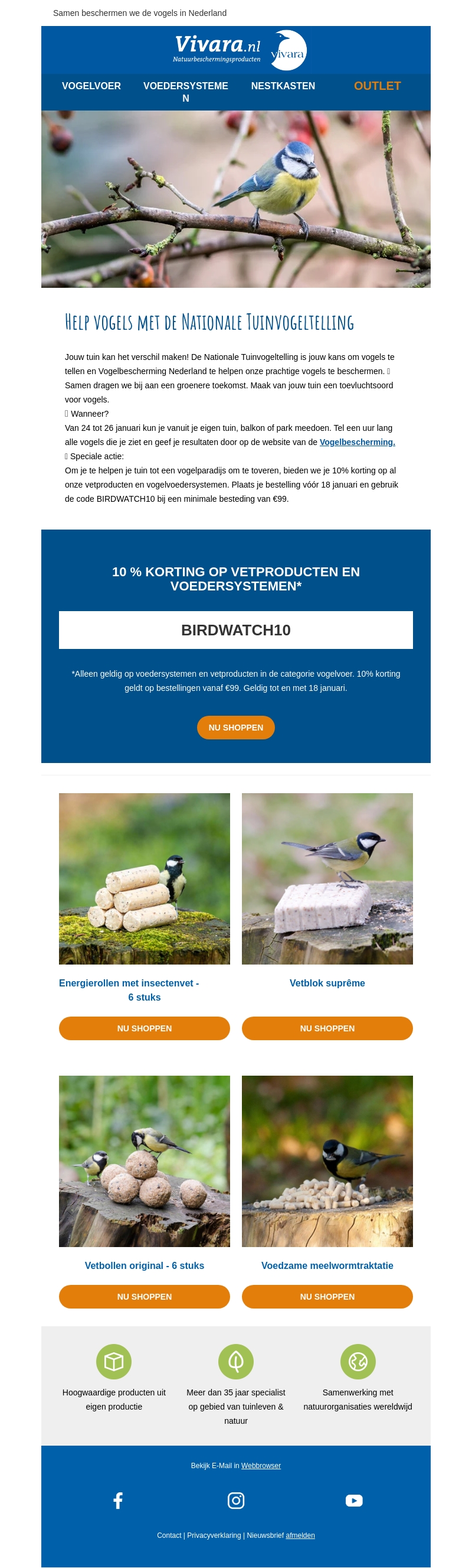 Steun de vogels in Nederland tijdens de Nationale Tuinvogeltelling. Tel vogels in je tuin en help bij het beschermen van deze prachtige dieren. Ontvang 10% korting op vetproducten en voersystemen met de code BIRDWATCH10. Geldig bij een minimale besteding van β¬99. Actie loopt tot en met 18 januari.