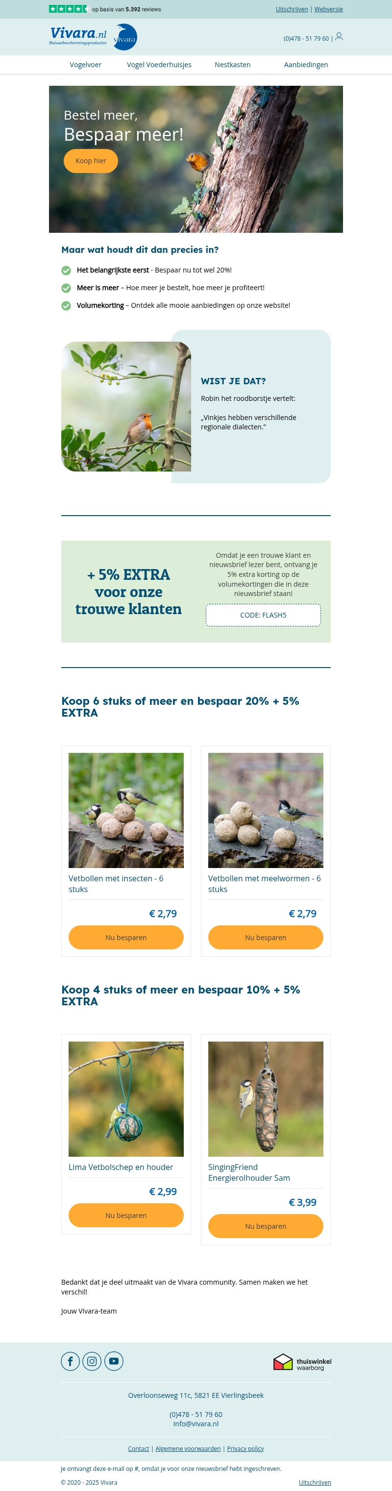 Vivara biedt nu voorjaarskortingen tot wel 25%. Bestel meer en bespaar meer met onze volumekortingen. Ontvang een extra korting van 5% voor trouwe klanten met de code FLASH5. Bekende producten zoals vetbollen en energierollen zijn nu voordelig geprijsd. Sluit je aan bij de Vivara community en maak het verschil in de natuur.