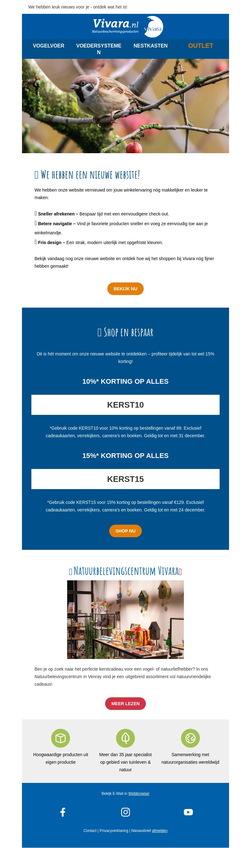Vivara lanceert een vernieuwde website voor een verbeterde winkelervaring. Profiteer van exclusieve kortingen tot 15% met de codes KERST10 en KERST15. Bezoek ook ons Natuurbelevingscentrum voor unieke kerstcadeaus. Wees snel, want de aanbiedingen zijn beperkt geldig!