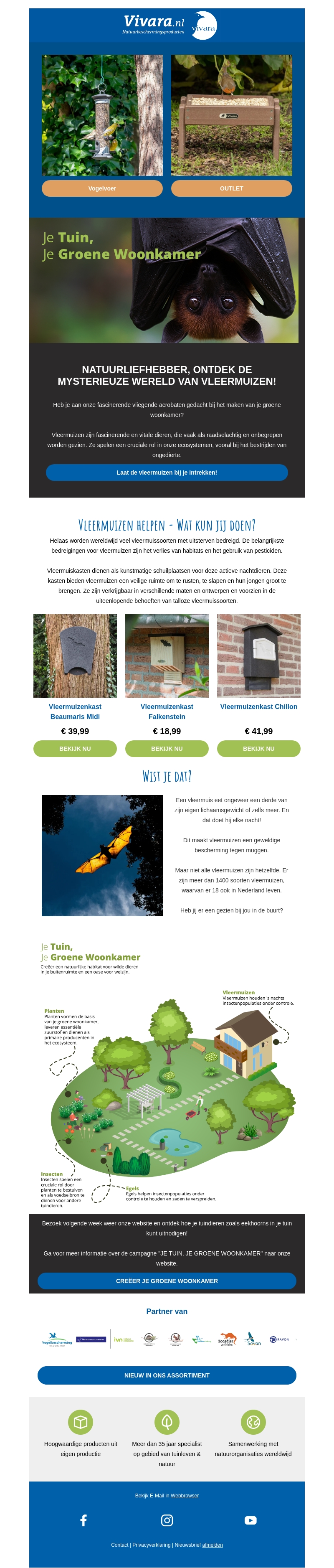 Natuurliefhebber, ontdek de mysterieuze wereld van vleermuizen! Ze spelen een cruciale rol in onze ecosystemen. Helaas worden wereldwijd veel vleermuissoorten met uitsterven bedreigd. Vivara biedt verschillende vleermuiskasten aan om deze dieren te beschermen. Creëer een natuurlijke habitat voor wilde dieren in je tuin met onze producten.