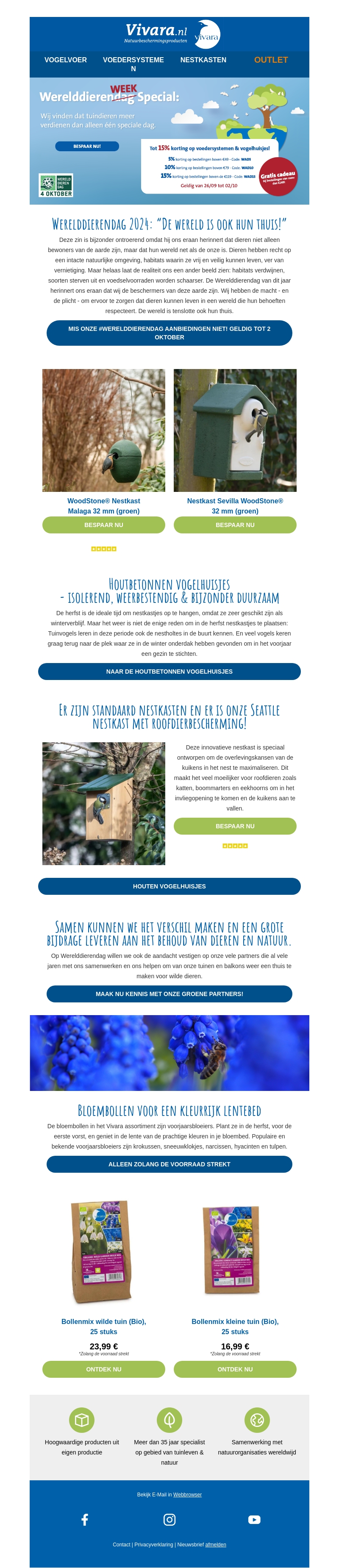 Ontdek de speciale aanbiedingen voor Werelddierendag bij Vivara.nl. Profiteer van kortingen op vogelhuizen en ander tuindierenaccessoires. Bescherm en verzorg tuindieren met onze duurzame producten. Alleen geldig tot 2 oktober.