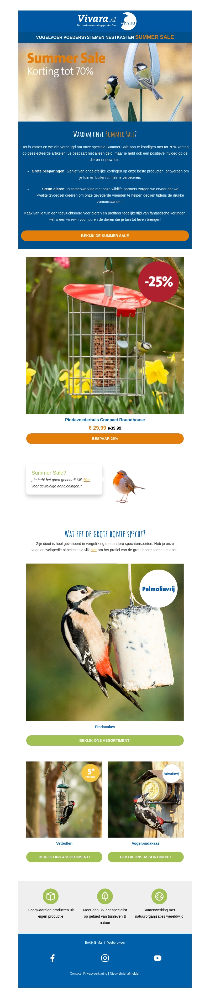 Het is tijd voor de Vivara Summer Sale! Geniet van fantastische kortingen tot wel 70% op een breed assortiment aan natuurvriendelijke producten. Of het nu gaat om vogelvoeding, voederhuizen of nestkasten, je vindt het allemaal in onze zomeruitverkoop. Mis deze kans niet en steun tegelijkertijd de natuur. Bezoek onze website voor meer informatie en geweldige aanbiedingen!