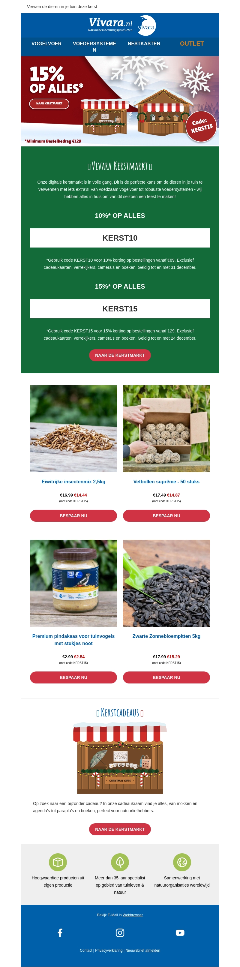 Beleef de feestelijke sfeer met Vivara's kerstmarkt. Geniet van tot 15% korting op al onze producten, ideaal om de dieren in je tuin in de watten te leggen. Gebruik de kortingscode voor het einde van het jaar. Mis deze kans niet om unieke kerstcadeaus te ontdekken, perfect voor natuurliefhebbers. Exclusieve aanbiedingen geldig tot 24 december. Bezoek nu de kerstmarkt!