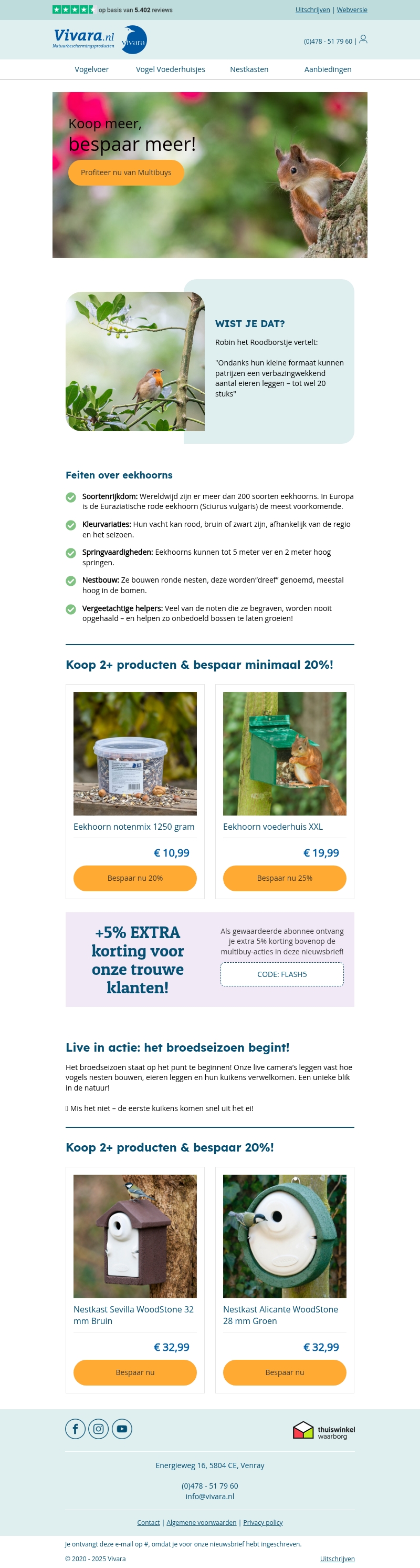 Vivara biedt nu geweldige kortingen met hun Multibuy aanbiedingen! Bespaar tot 25% op producten zoals notenmixen en voederhuizen. Ontvang een extra 5% korting met de code FLASH5. Mis deze kans niet om je tuin wildvriendelijker te maken en maak eekhoorns blij!