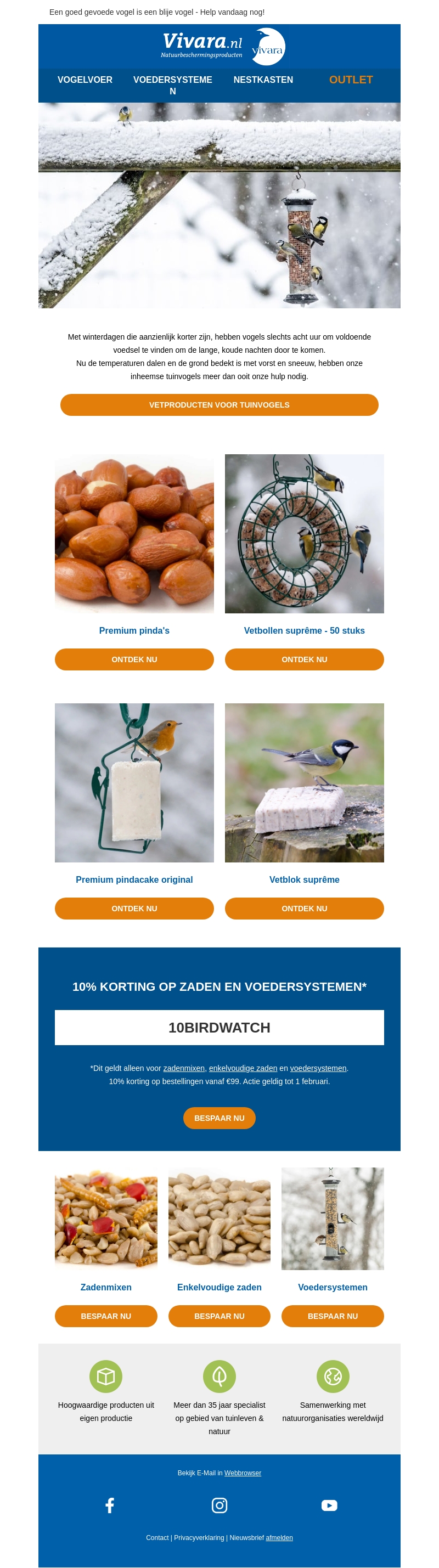 Deze winter hebben vogels meer hulp nodig met het vinden van voedsel. Vivara biedt kwaliteitsproducten zoals vetbollen en zadenmixen. Profiteer nu van 10% korting op zaden en voedersystemen. Zorg ervoor dat uw tuin een vogelparadijs blijft. Actievoorwaarden gelden.