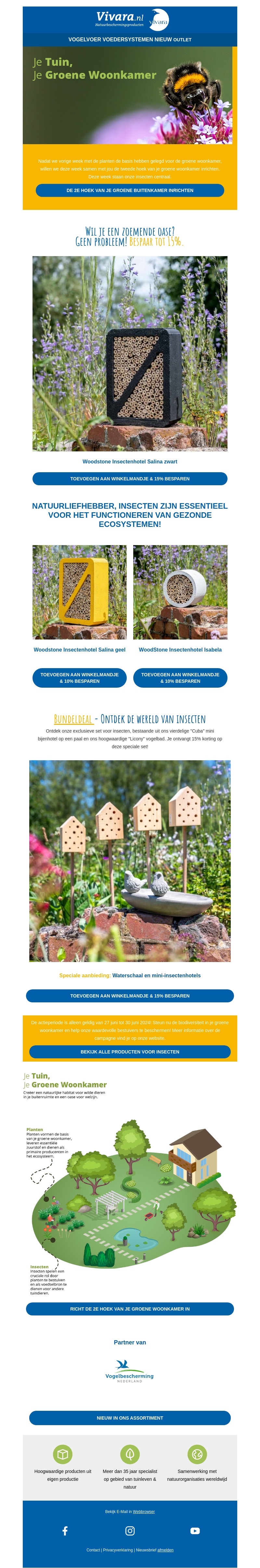 Ontdek de nieuwste collectie insectenhotels van Vivara.nl. Perfect voor het creΓ«ren van een gezonde en duurzame tuin. Werk samen met de natuur om van je buitenruimte een ware groene oase te maken. Bespaar tot 15% op geselecteerde producten. Maak je tuin gereed voor een zoemende zomer!