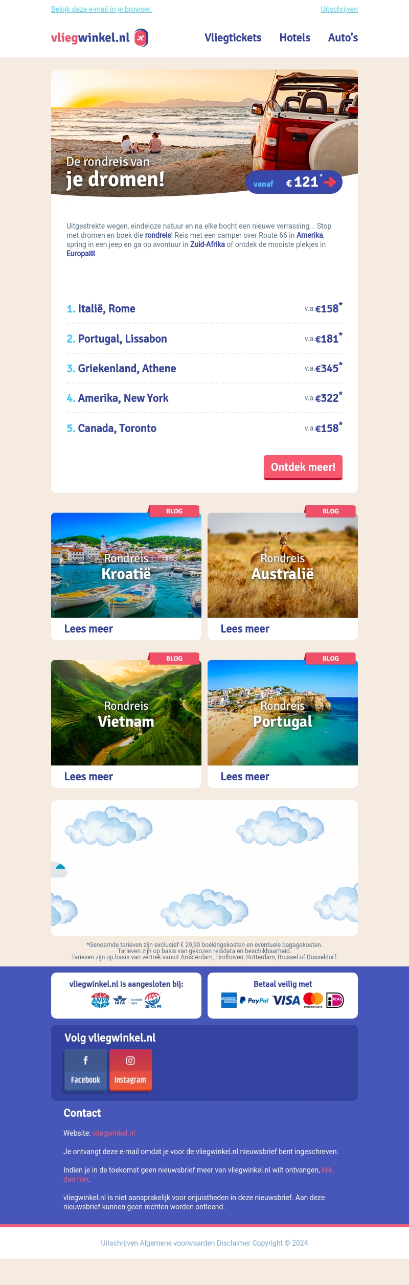 Beleef je droomrondreis met vliegwinkel.nl! Kies uit spannende bestemmingen zoals Amerika, Europa, en Zuid-Afrika. Boek nu voordelig je reis, met scherpe tarieven vanaf €121. Ontdek prachtige plekken en ga op onvergetelijke avonturen.
