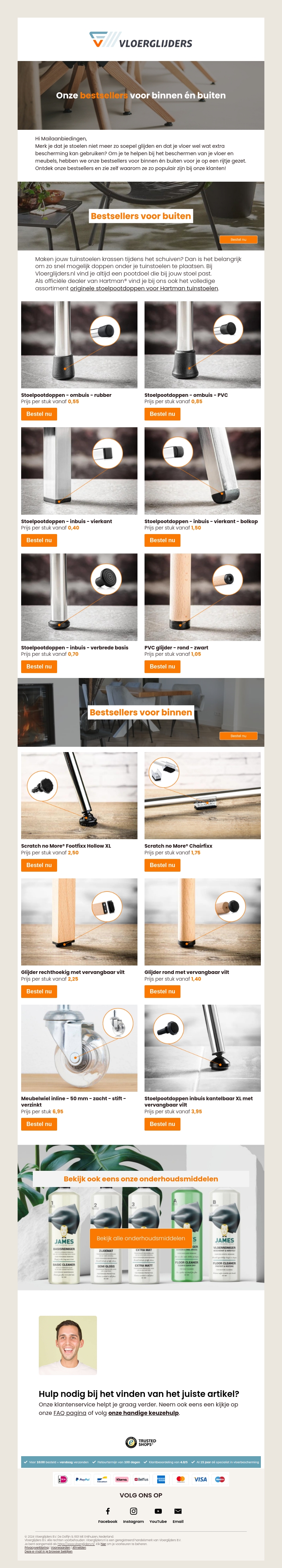 Bekijk onze bestsellers aan vloerglijders die ideaal zijn voor zowel binnen- als buitenvloeren. Verminder krassen en zorg voor extra bescherming voor jouw vloeren. Ontdek nu ons assortiment en kies de perfecte glijders voor jouw meubels.