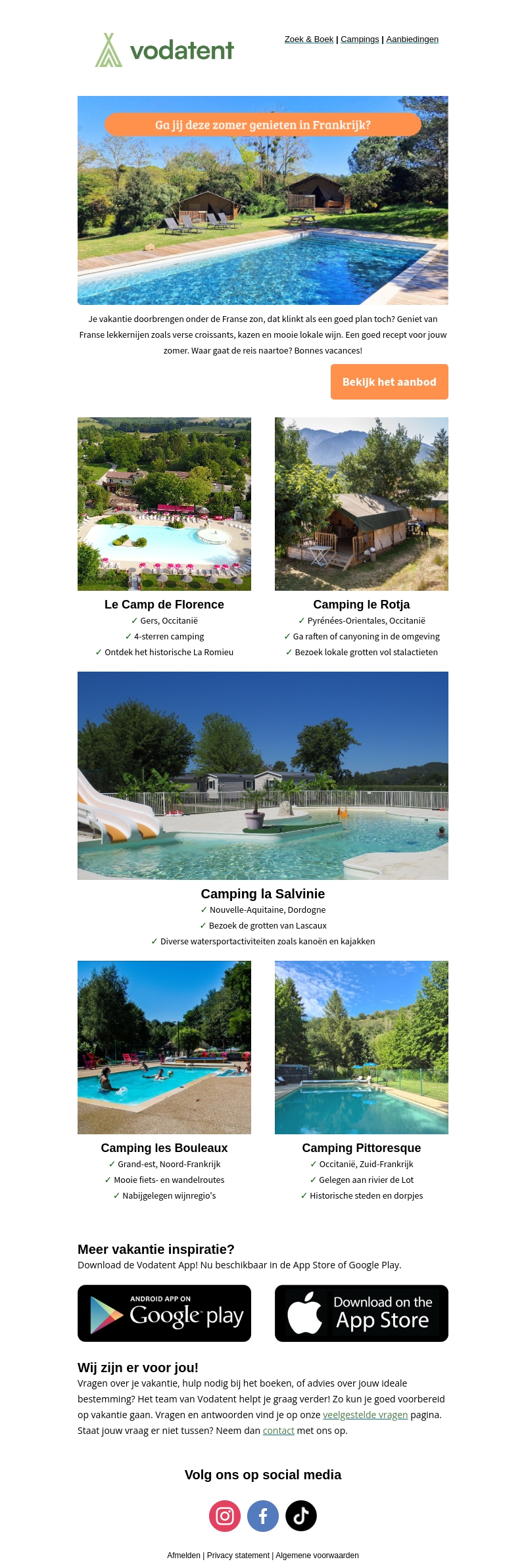 Verblijf deze zomer op een van de prachtige campings in Frankrijk aangeboden door Vodatent. Geniet van lokale Franse lekkernijen en ontdek historische plekken. Of je nu houdt van avontuur of ontspanning, er is een camping voor elke smaak. Bekijk onze aanbiedingen en begin jouw Franse avontuur. Download de Vodatent App voor meer inspiratie.