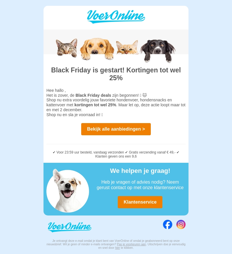 Black Friday is gestart bij VoerOnline met fantastische kortingen tot wel 25%! Profiteer van aanbiedingen op je favoriete honden- en kattenvoer. Deze speciale actie loopt tot 2 december, dus sla snel je voorraad in. Bestellingen voor 23:59 worden vandaag nog verzonden. Mis het niet!