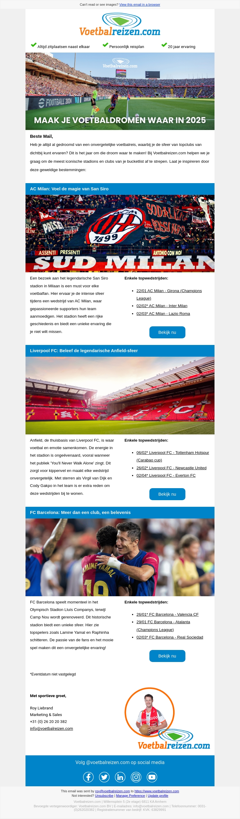 Heb je altijd al gedroomd van een onvergetelijke voetbalreis? Dit is het jaar om die droom waar te maken. Bezoek legendarische stadions zoals San Siro, Anfield en Camp Nou. Ervaar de intense sfeer en steun je favoriete teams. Mis deze unieke kansen in 2025 niet!