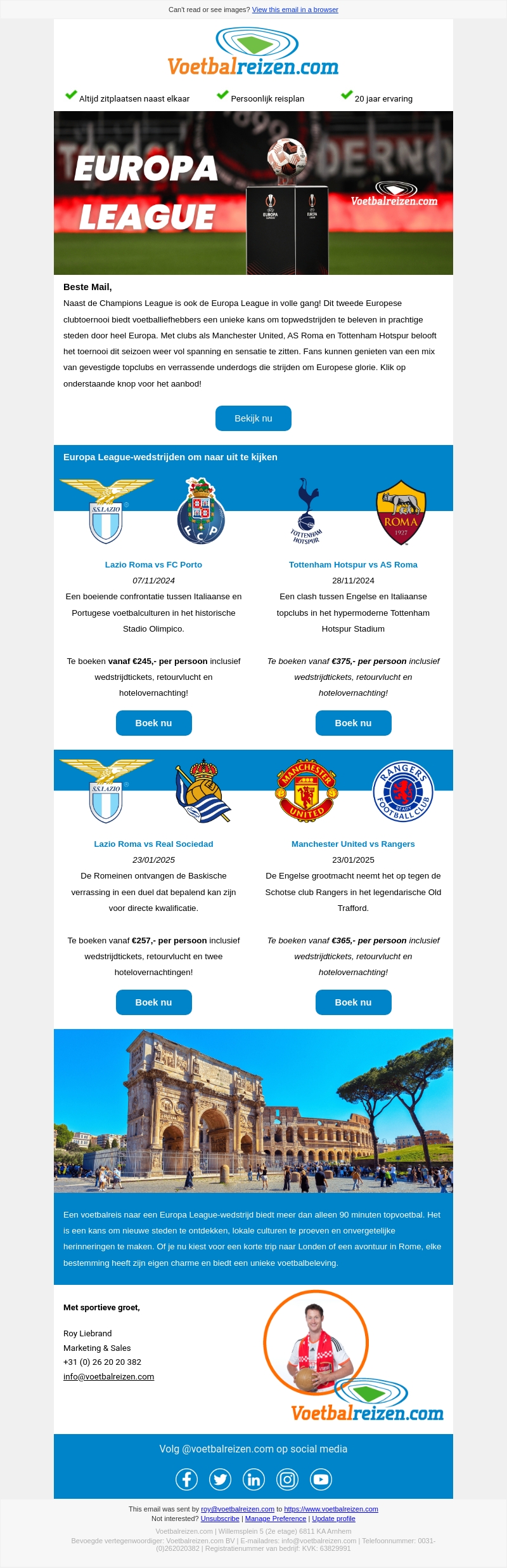 Naast de Champions League is ook de Europa League in volle gang. Dit toernooi biedt voetballiefhebbers unieke kansen om topwedstrijden bij te wonen in prachtige steden door heel Europa, zoals Manchester United, AS Roma, en Tottenham Hotspur. Boek nu voor een onvergetelijke voetbalreiservaring!