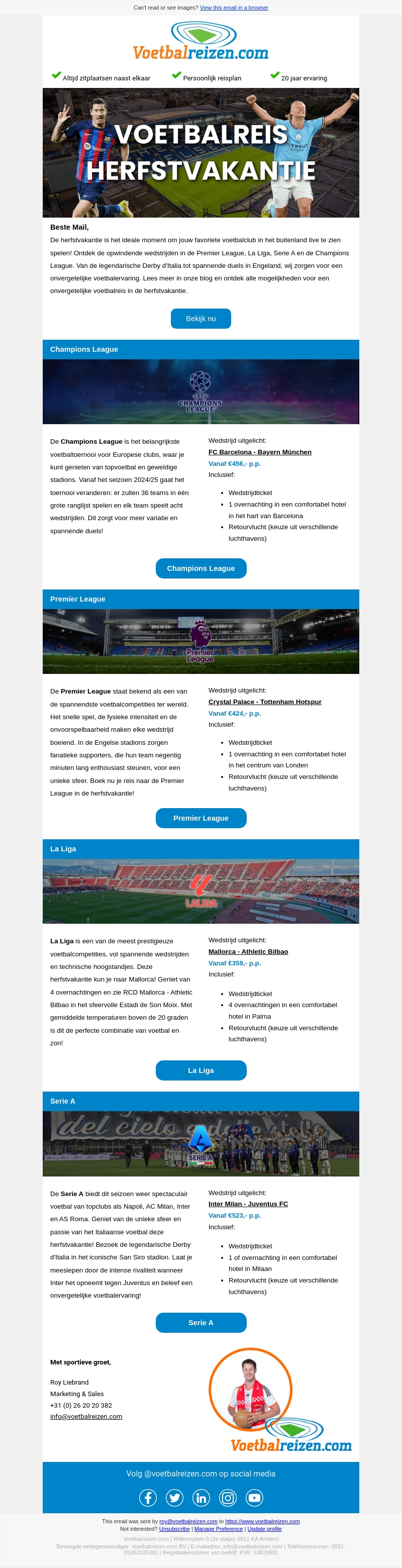 De herfstvakantie is het perfecte moment om je favoriete voetbalclub in het buitenland te zien spelen. Kijk uit naar wedstrijden in de Champions League, Premier League, La Liga, en Serie A. Boek nu je onvergetelijke voetbalreis met Voetbalreizen.com!