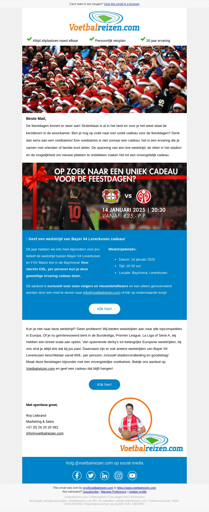 De feestdagen staan voor de deur en Voetbalreizen.com heeft het perfecte cadeau-idee. Beleef live wedstrijden van topteams zoals Bayer 04 Leverkusen tegen FSV Mainz. Voor slechts €35,- per persoon geniet je van een unieke ervaring die je niet wilt missen. Ontdek meer exclusieve aanbiedingen voor nieuwsbrieflezers.
