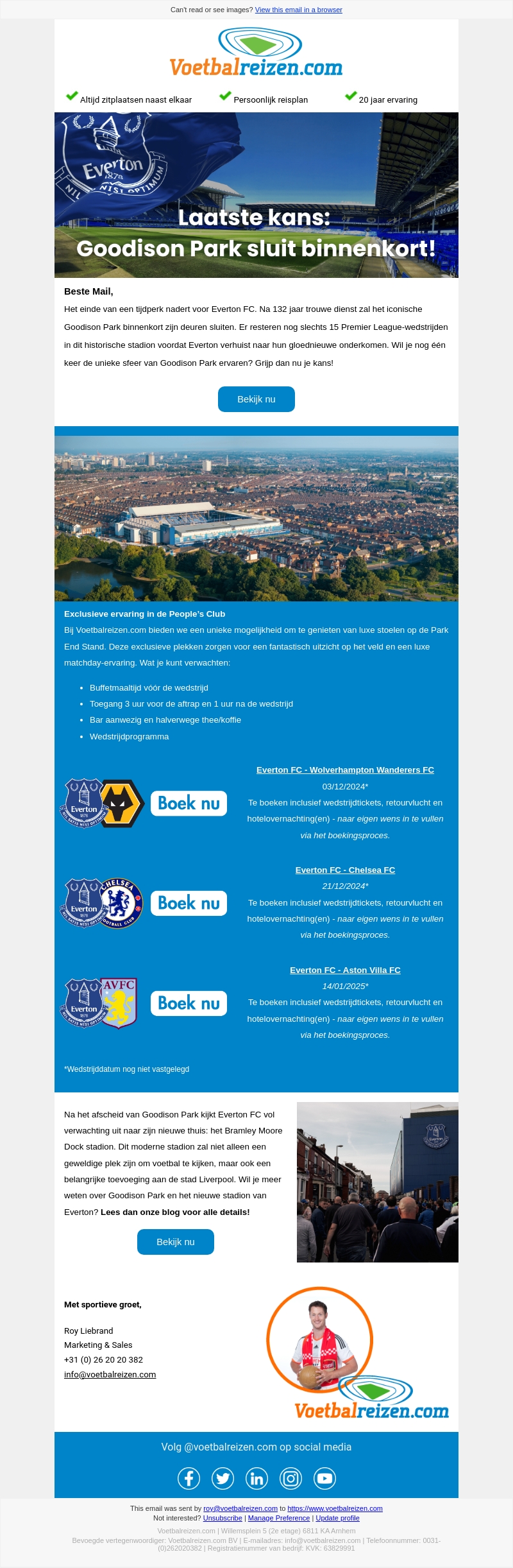 Goodison Park, het iconische thuis van Everton FC, sluit binnenkort. Dit is je laatste kans om de historische sfeer te ervaren met unieke boekingen via Voetbalreizen.com. Geniet van luxe stoelen, uitstekende uitzichten en een exclusieve matchday-ervaring. Boek nu je tickets voor de laatste onvergetelijke momenten. Lees ook meer over Everton's toekomstig stadion Bramley Moore Dock.