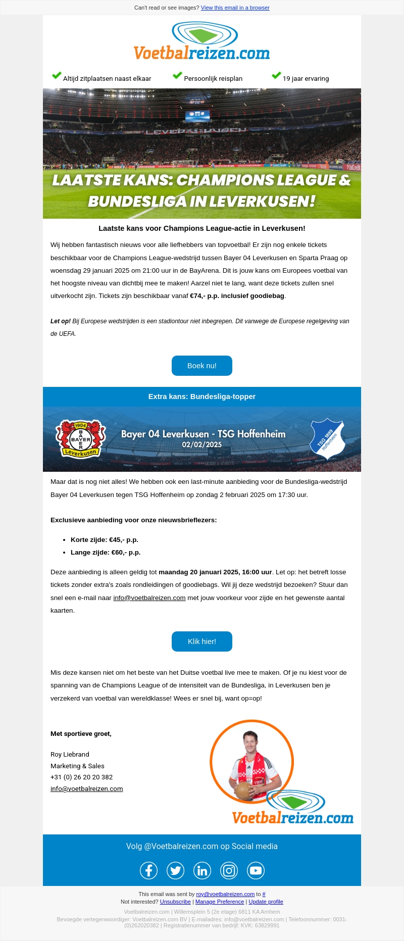 Grijp je kans om de Champions League-wedstrijd Bayer 04 Leverkusen vs Sparta Praag en de Bundesliga-clash tegen TSG Hoffenheim live mee te maken. Tickets vanaf €74,- inclusief goodiebag. Mis niet de exclusieve nieuwsbriefkorting voor de zijkanten van het stadion. Wees er snel bij, want op=op!