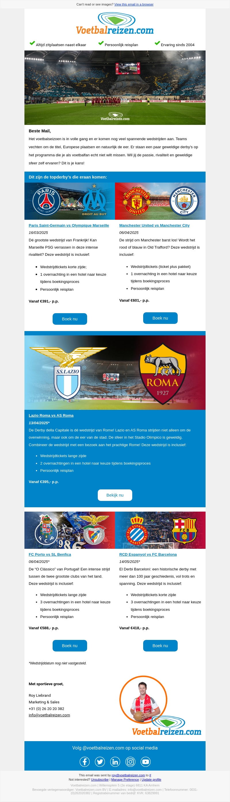 Het voetbal seizoen is in volle gang en er staan spectaculaire derby's op het programma. Bezoek wedstrijden zoals PSG tegen Marseille en Manchester United tegen Manchester City. Profiteer van gepersonaliseerde reisplannen en comfortabele zitplaatsen. Begin nu met het plannen van een onvergetelijke voetbalervaring!