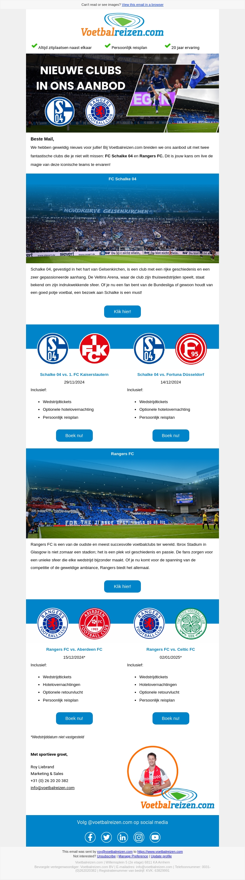 Voetbalreizen.com breidt uit met twee iconische voetbalclubs: FC Schalke 04 en Rangers FC. Beleef de passie en geschiedenis van deze clubs live in hun legendarische stadions. Verzeker je nu van een plek voor onvergetelijke wedstrijden. Ontdek ook de optionele hotelarrangementen en persoonlijke reisplannen. Ervaar de sfeer en sensatie van internationaal voetbal!