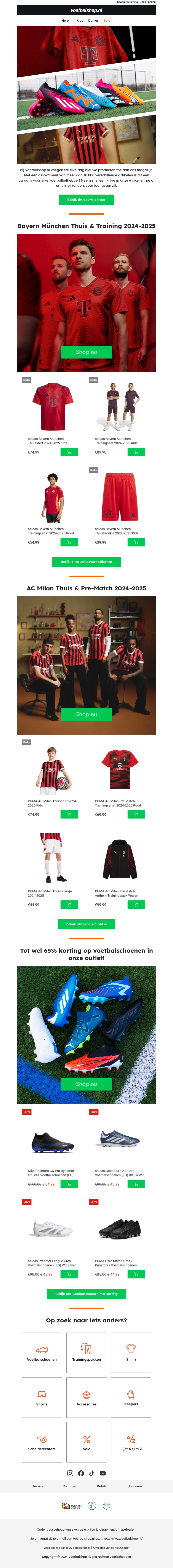 Bij Voetbalshop ontdek je de nieuwste voetbalkleding en -schoenen van topmerken zoals Bayern München en AC Milan. Geniet van aantrekkelijke kortingen tot wel 65% op voetbalschoenen in onze outlet. Neem een kijkje bij onze collecties voor thuis, training en wedstrijden. Bestel nu en heb je favoriete artikelen snel in huis.