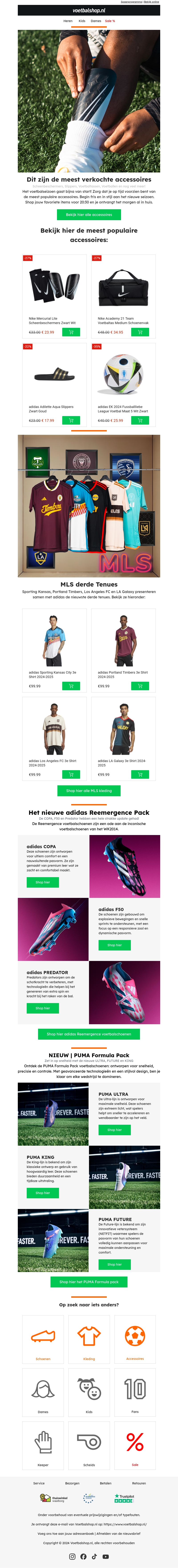 Ontdek de beste voetbalaccessoires voor het nieuwe seizoen. Bekijk de nieuwste adidas 3e MLS kits en de innovatieve adidas Reemergence voetbalschoenen. Vergeet niet de nieuwe PUMA Formula voetbalschoenen te bekijken voor ultieme snelheid en precisie. Shop nu en bereid je voor op het nieuwe seizoen.