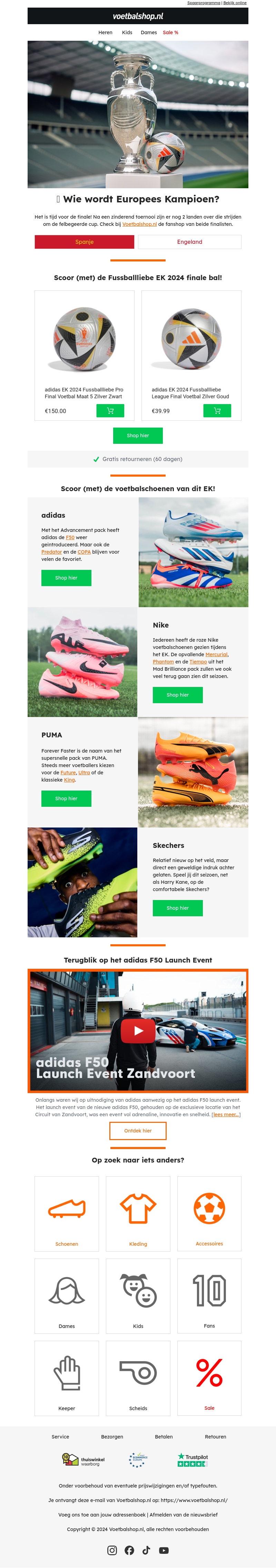 Het is tijd voor de spannende finale van het EK 2024! Ontdek de nieuwste voetballen en voetbalschoenen van topmerken zoals adidas, Nike, PUMA, en Skechers. Bekijk ook onze terugblik op het exclusieve adidas F50 Launch Event. Shop nu en mis het niet!