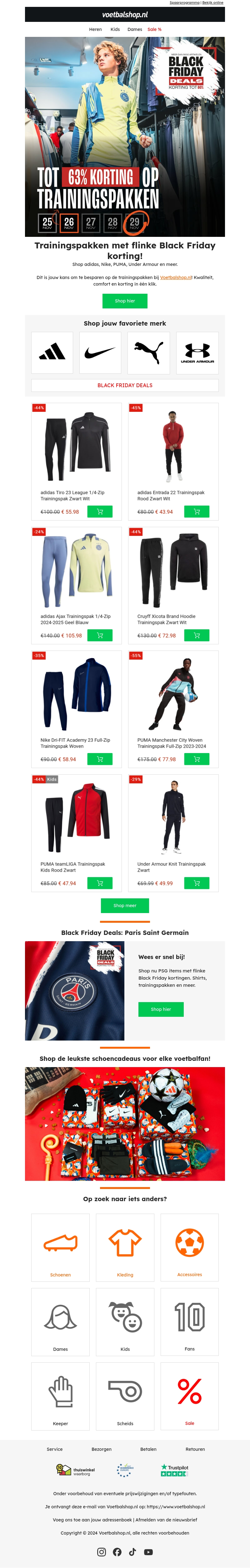 Beleef de beste Black Friday deals met kortingen tot 63% op trainingspakken. Vind aanbiedingen van topmerken zoals Nike, Adidas, en Puma. Bekijk ook speciale deals voor kinderen en exclusieve clubcollecties. Mis deze kans niet om kwaliteitsproducten tegen gereduceerde prijzen te kopen. Shop nu bij Voetbalshop voor ongeëvenaarde kortingen. Uw favoriete trainingspak wacht op u!