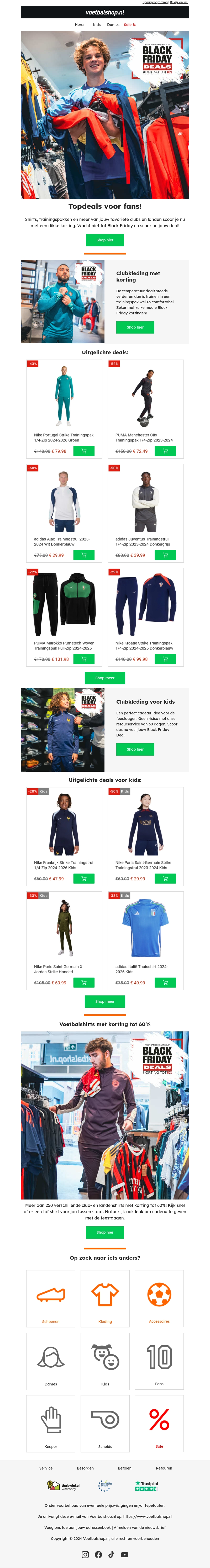 Vier Black Friday met fantastische kortingen op trendy sportkleding en accessoires. Profiteer van aantrekkelijke deals voor dames, heren en kinderen. Bereid je voor op het nieuwe seizoen met de geweldige aanbiedingen die je niet wilt missen. Kijk ook naar speciale kortingen op clubkleding en trainingssets.