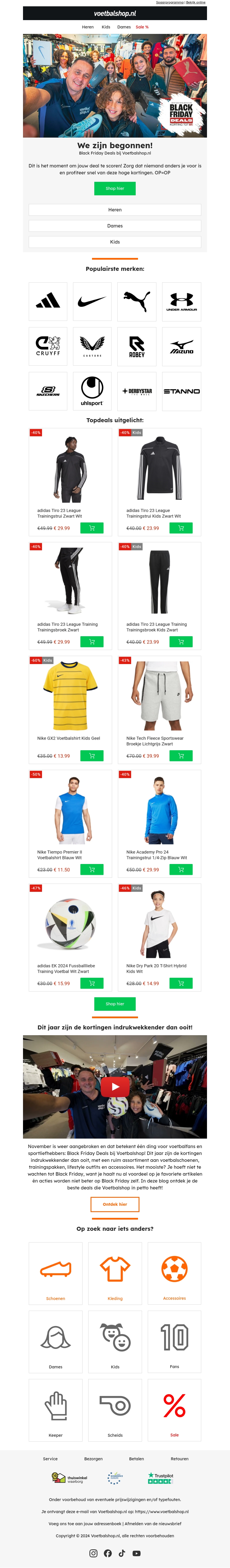 Voetbalshop.nl heeft zijn Black Friday verkoop gelanceerd! Profiteer van kortingen tot 80% op meer dan 5.000 aanbiedingen. Of je nu op zoek bent naar de nieuwste sportkleding, accessoires of schoenen, we hebben iets voor iedereen. Mis deze kans niet om te besparen op topmerken zoals Adidas, Nike en meer. Shop vandaag nog en ontdek de deals voordat ze weg zijn. Countdown naar de feestdagen begint met geweldige besparingen!