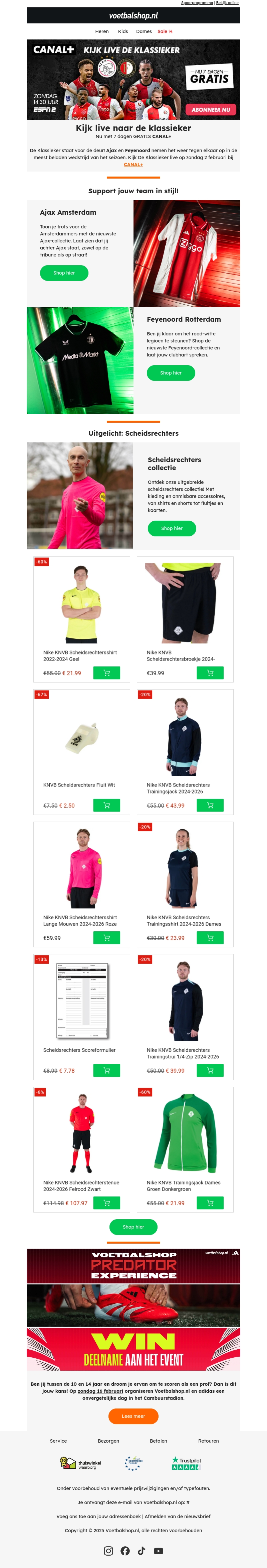 De klassieker tussen Ajax en Feyenoord staat voor de deur! Bereid je voor met stijlvolle teamoutfits van de officiële collectie. Ontdek nu ons speciale aanbod voor scheidsrechters en fans. Pak je kans om live te kijken via Canal+ en krijg 7 dagen gratis ESPN. Wordt de ultieme supporter met onze exclusieve deals.
